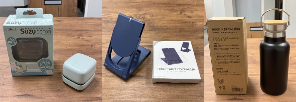 左:ソニック卓上掃除機「スージーコロン」 / 中:ポケットワイヤレスチャージャー / 右:ステンレスボトル350ml